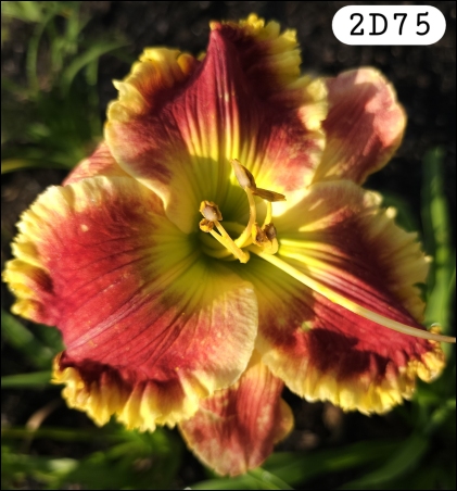 Tet Sev 6" bloom with 16 buds on a 22" scape. This beauty is a heavily ruffled flower with a ruby red base, large yellow edge and chartreuse throat. Named to honor all those who fight for our freedom, something we should never take for granted here in our great country!