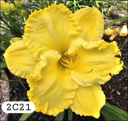 Tet Sev 6" bloom, 14 buds on a 24" scape. This HEAVY substance, almost perfectly round flower is truly a standout in ANY garden. This color shows from a great distance, and is pure with no discoloration! Heavily ruffled lemon self with a tiny olive throat.