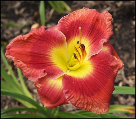 Diploid. This is yet another big flower, with an imposing eye. Reds on red are not that common here, but what sets this one apart is the very unique veining that appears on the petal edge of the ruffles, which appear in a lighter shade that the petal bloom itself! 25" 6" blooms; 17 to 20 buds; Semi Ev.
