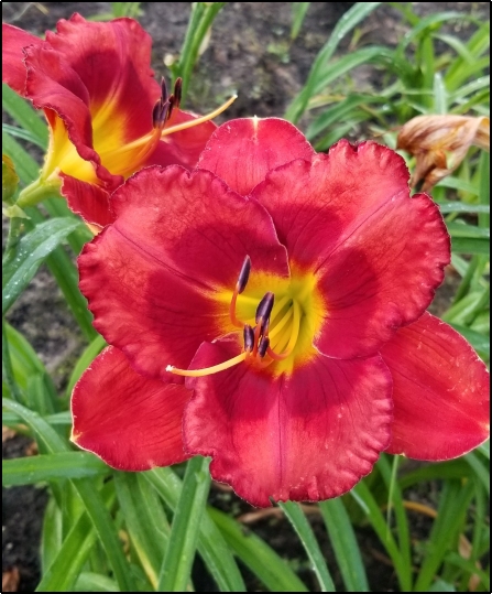 Tet. A wonderful raspberry red color with a deeper red eye. A “flat as a pancake opener, this one always stops me in my tracks. And yes, the sepals are very wide, flat and blunt, helping to set this one apart. 28" 6.5" bloom; 14 to 17 buds, Evergreen.